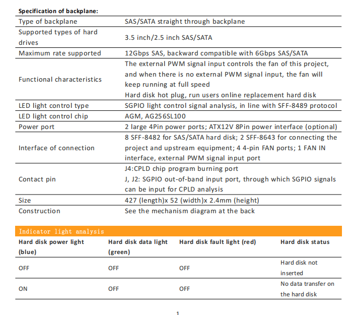 The built-in straight back can connect up to 8*SAS/SATA disk connection scheme is optional, provides a large 4PIN and 8PIN power supply interface to choose from, two SFF8643 data access ports support 12Gbps, 6Gbps protocol SAS/SATA hard disk. The AGM CPLD chip is embedded in the backplane, which can support SGPIO signal interpretation, and real-time monitoring of hard disk working status; adopts the lamp control and management chip, and feeds back the use of the LED status indicator in time.