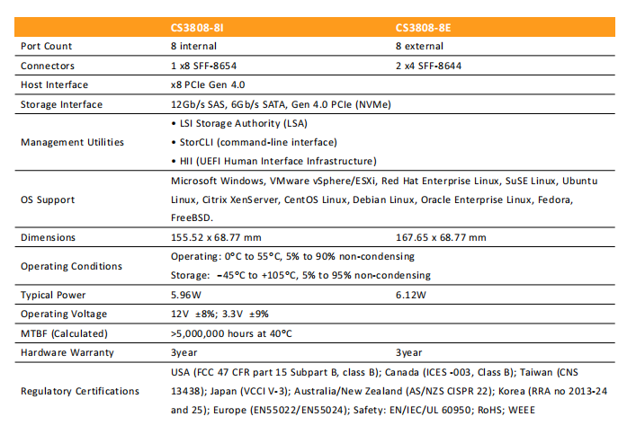 CEACENT CS3808-8E is a PCI Express 4.0 * 8 eight port NVMe HBA hard drive expansion card independently developed by CEACENT based on the LSI SAS3808 main control scheme. The adapter automatically negotiates backward compatibility with previous SAS and PCI-E versions