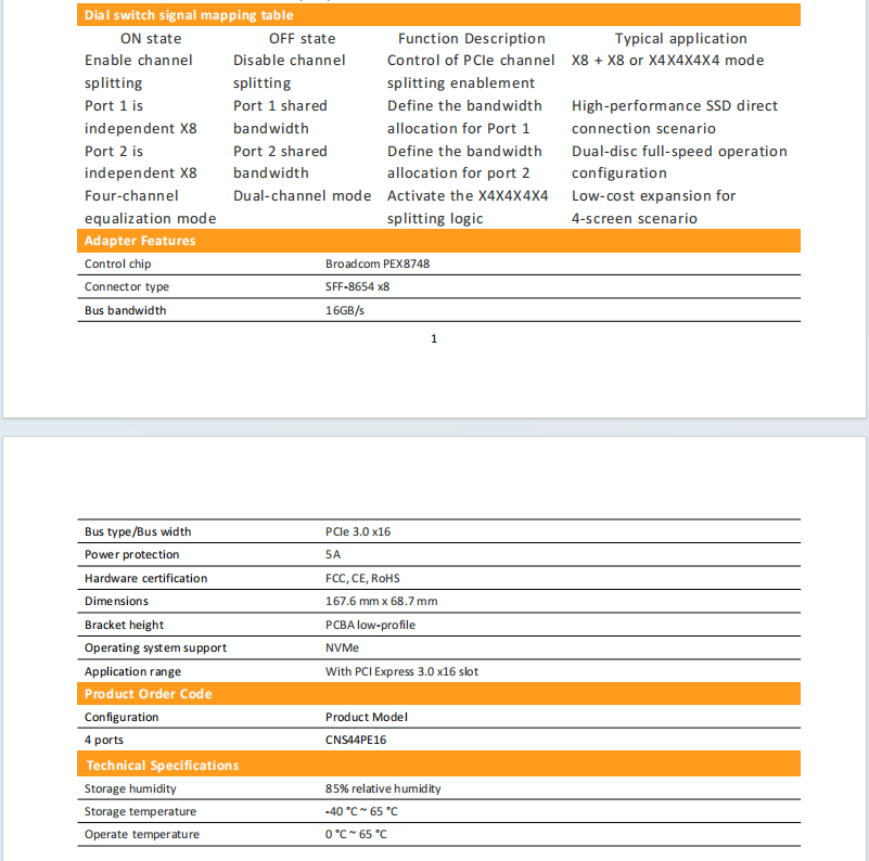 1. The motherboard BIOS must support UEFI mode, and the operating system must support NVMe mode. This card can be paired with the SFF-8654 to PCIE RISER card, and through two 8654 cables, it can expand the PCIE X16 slot.