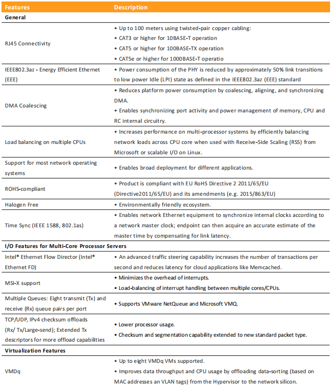 • Innovative power management features including Energy Efficient Ethernet (EEE) and DMA Coalescing for increased efficiency and reduced power consumption