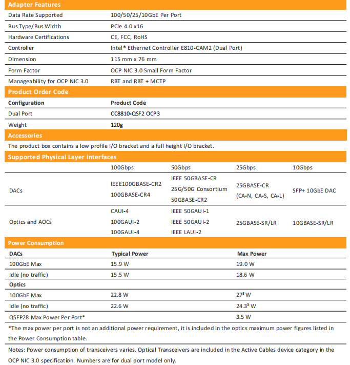CC8810-QSF2 OCP3 support a wide range of system configurations to meet customer needs and workload requirements. The many port and speed combinations available simplify validation and deployment.