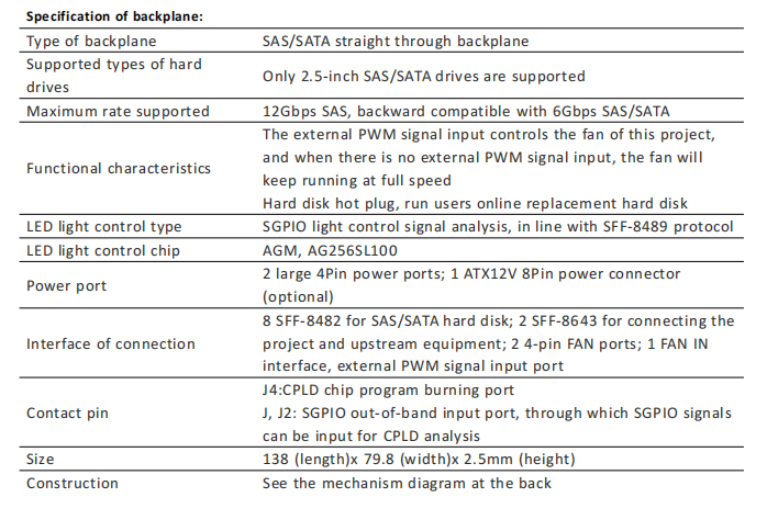 The built-in straight-through backplane can connect up to 8*SAS/SATA disks. The product provides 2 large 4PIN power supply ports and 1 ATX12V 8Pin power supply ports for customer choice. 8 SFF-8482 are used to connect SAS/SATA disks. 2 SFF-8643 for connecting this project and upstream devices. Secondly, an AGM CPLD chip was embedded in the backplane, which could support SGPIO signal interpretation and monitor the working state of the hard disk in real time. The lamp control management chip is used to feedback the use of the LED status indicator in time.